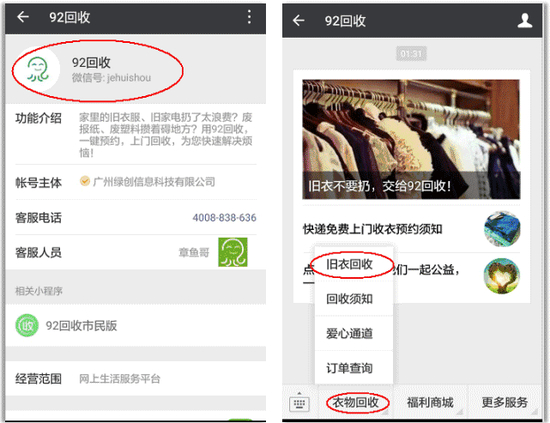 92回收是由广州市供销合作社出资打造的、一个“上门回收+旧物管理”的移动互联网APP,当前平台入驻广州市的微信城市服务功能,且经联合国开发计划署认可,入选商务部创新回收模式案例,92回收致力于实现“旧衣零抛弃,回收最便捷”的环保目标。关注”92回收“公众号,即有人上门回收您不要的衣服,让你足不出户,秒变环保达人,他们用专业的旧衣服处理流程把废旧衣物用于环保再生、山区捐赠、手工艺品等。