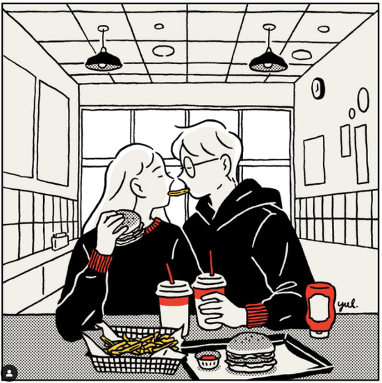 他们会在快餐店,穿着情侣装,像偶像剧的男女主一样,吃一根薯条。