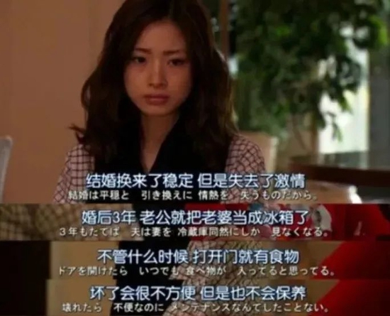 “结婚就是用失去热情来换取安稳,过了三年,丈夫只会把妻子当成冰箱一样对待。打开就有吃的,坏了也不去维修。”