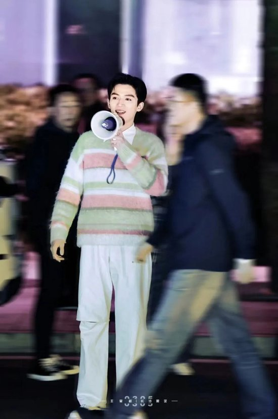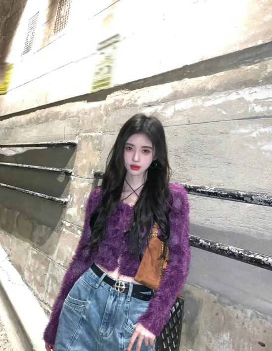 譬如鞠婧祎的这身紫色仿马海毛开衫,紫色在面料本身性质和光线的加持下,呈现深浅不一的杂糅和亮闪,非常吸睛。