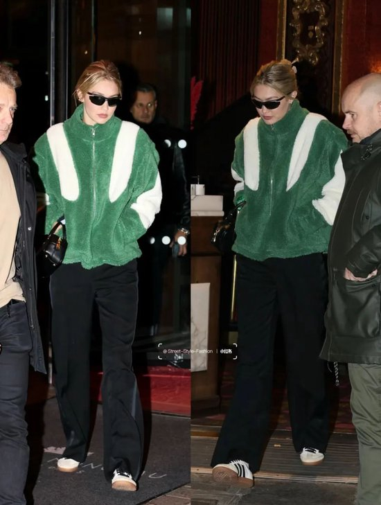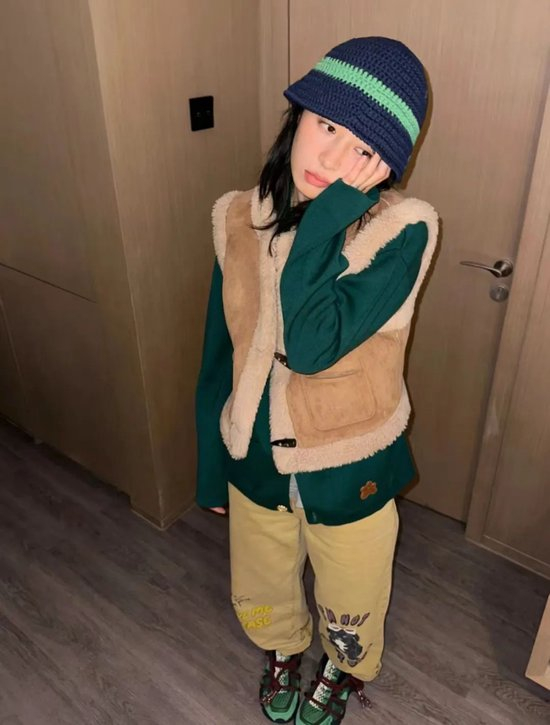 如果当天气温没有个位数的话,羊羔绒的背心也是叠穿的好单品,通过和内搭的图案的碰撞,颜色的对比,时髦度杠杠的。