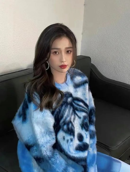 虞书欣的这件仿马海毛毛衣运用了大面积的人像图案,黑色、深蓝、浅蓝、白色犹如油画一般在胸前铺开,袖口部分呈渐变的晕染,极其好看。