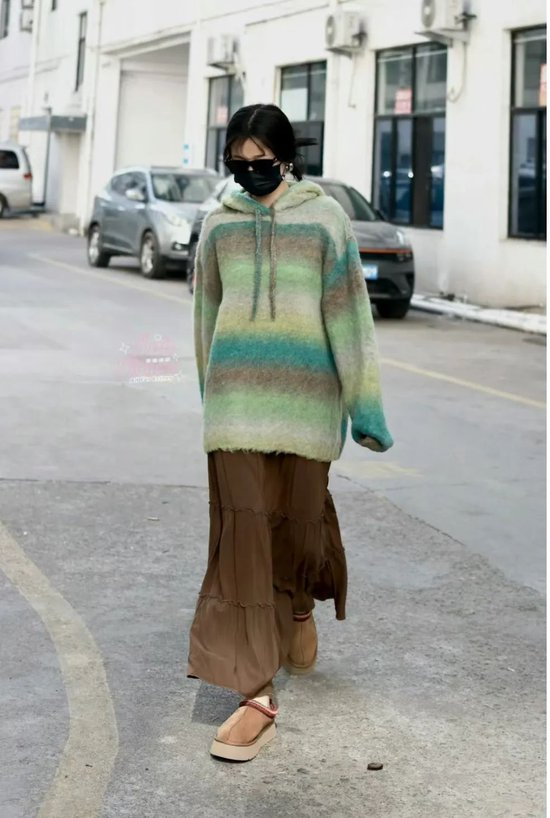 这身仿马海毛oversize连帽卫衣,搭配垂坠感好的棕色长裙,给人气质温婉的感觉。