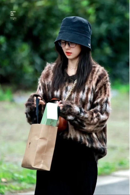 白鹿的两件都是仿马海毛材质的,不同的颜色和款式明显呈现两种风格来。美拉德风的v领毛衣由同色系组的色块拼接错杂而成,简单搭配棕色牛仔裤和裙装营造文艺感人设~