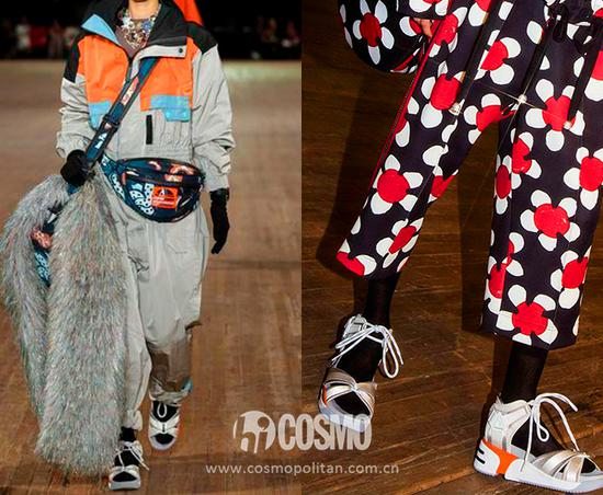 从Marc Jacobs到Marni的2018春季秀场,交叉款运动凉鞋就开始在秀场蔓延。他们都不约而同选择明亮的色彩和运动鞋底做搭配,Marni还在鞋面上融入了充满古典质感的珍珠、水晶装饰,赋予了运动凉鞋新的生命力。