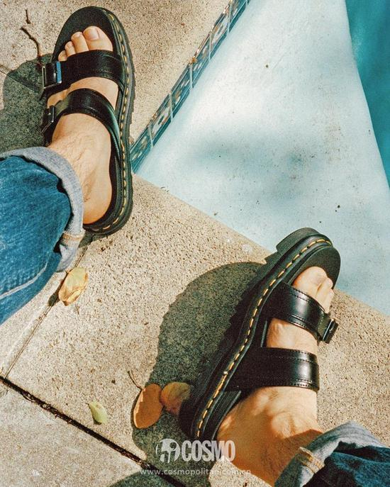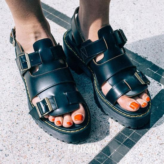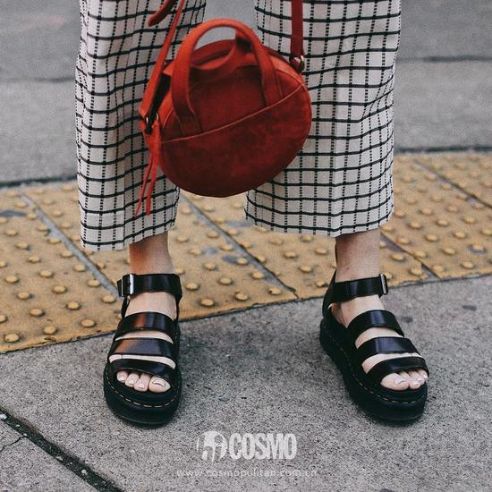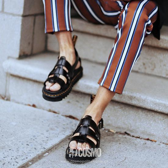 认真看文章的选手一定有注意到前面不少明星都有有穿Dr.Martens的运动凉鞋,Dr.Martens确实是今年的一大热门,朋克感十足的宽带装饰在脚面想不吸睛都难。