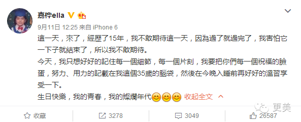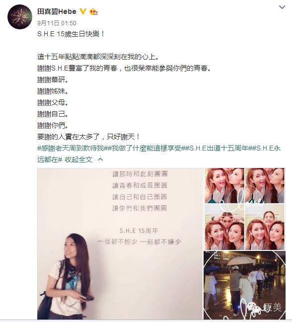 到9月11日,是SHE在一起15周年了,虽然Selina出了意外之后三个人开始了单飞不解体的各自发展,但是彼此从来没有错过任何一个重要时刻。