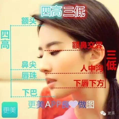 “三低”:两个眼睛之间,鼻额交界处必须是凹陷的;在唇珠的上方,人中沟是凹陷的,美女的人中沟都很深,人中脊明显;下唇的下方,有一个小小的凹陷,共三个凹陷。