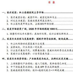 由上述判断,投资价值较高的领域主要是上游的微整形产品领域、中下游的医美导流领域,中游的医美机构较为分化,需关注建立了品牌与客户资源、连锁化能力强的医美医院。