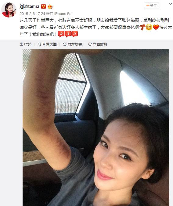 通过刮痧来缓解身体问题的明星其实还有好多,刘涛通过刮痧来缓解心脏不适