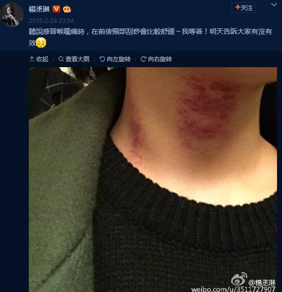 杨丞琳感冒喉咙不舒服,也会给颈部刮刮痧