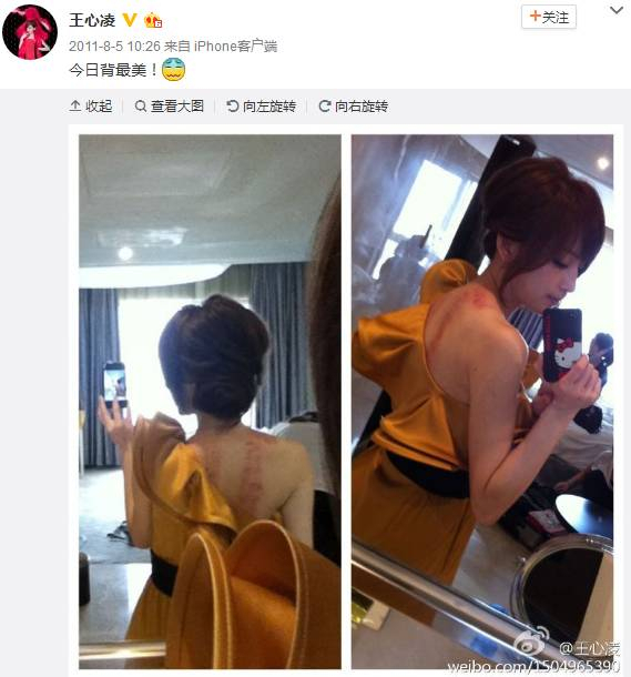 王心凌出席活动前,对着卫生间的镜子拍下自己满背刮痧后还没消退的红痕