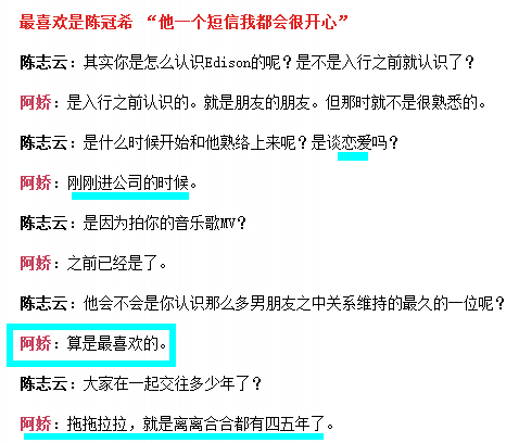 然而分手原因是阿娇在2009年3月参加《志云饭局》重谈某门事件始末时,说出了陈冠希是她最喜欢的男朋友。