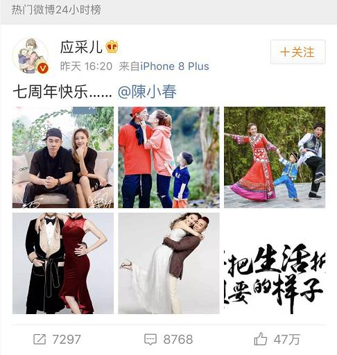 昨天应采儿发了一条“七周年快乐”的微博,点zan数47万,竟然超越了孙俪夫妇成为了榜单第一,果然大佬的女人就是不一般啊。