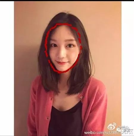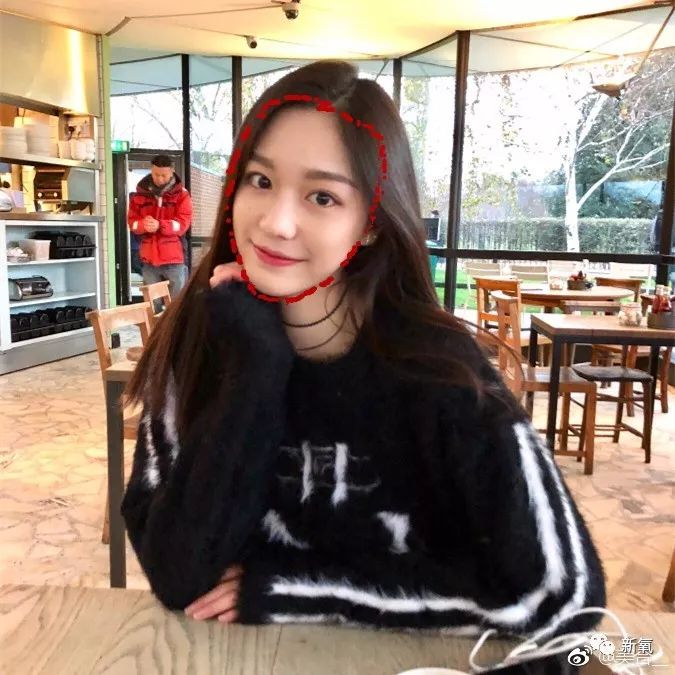 但实际上她的脸型是,下巴很短,下颌角略宽的有点方的脸。