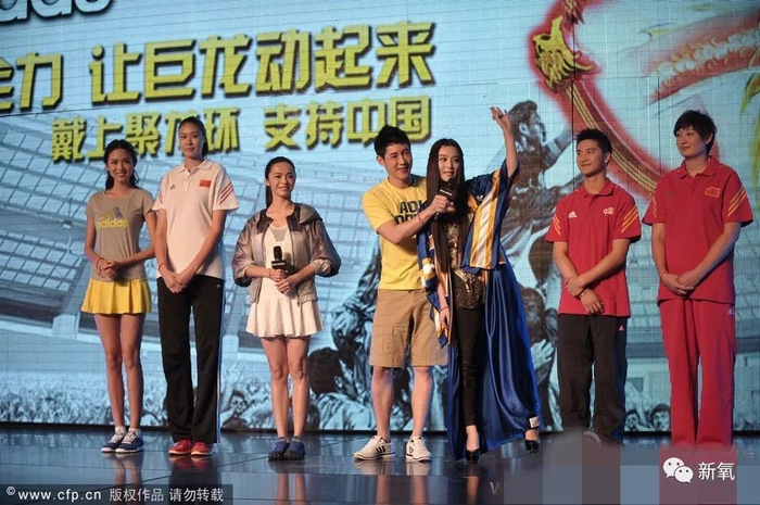 关于身高抓眼球的更极端的例子是这个。下面照片中的人都是大高个,但你会先注意到左二穿白色衣服的人,而旁边的姚晨你得盯着看好几秒才认得出来。而且姚晨是占在视觉中心的,优势会更大。这是因为身高高导致所占的面积大,在视觉上更会被注意到。