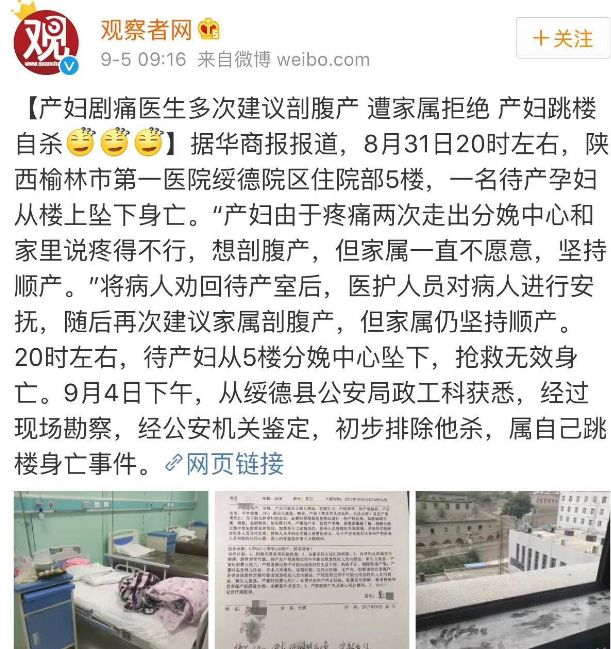 10年过去了,人们并没有在惨案中自醒,去年“榆林市产妇跳楼事件”不也是坚持顺产固执想法的婆家造成的悲剧吗?产妇因为难以忍受疼痛两次走出分娩中心,还疼到跪地,婆家却不顾她的安危,最后心死跳楼身亡。