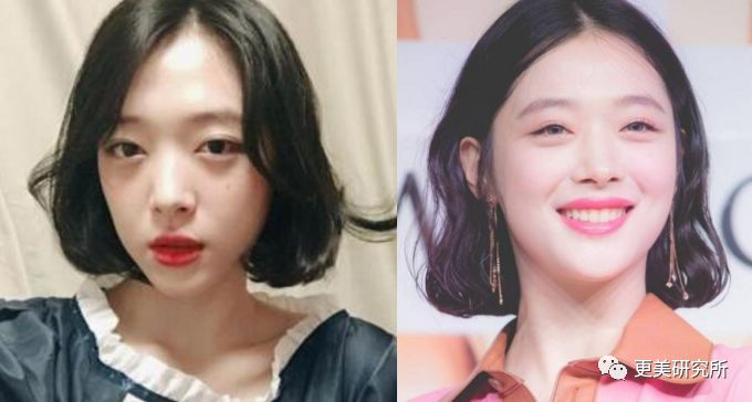 小编帮她修窄了下颌,把圆下巴变成尖下巴后,减少了憨厚感,多了一些女性的娇俏和柔美感。