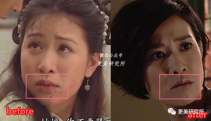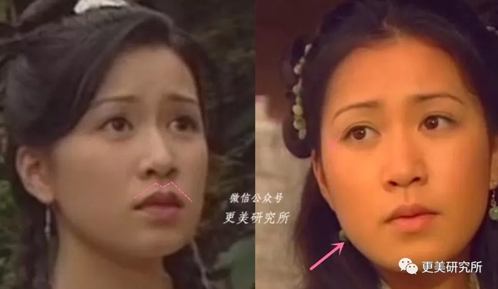 由于阿佘的上唇缩窄,人中也相对变长了许多,人中越长越显老,人中越没有形态越宽越有年龄感,对比她少女时期,她现在的人中沟都已经变的毫无棱角感。