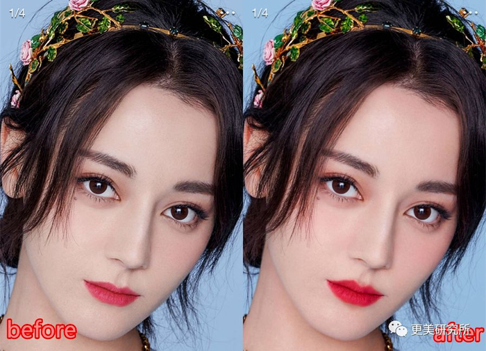 以下图的热巴为例,她的人中算是中等长度,因为上唇太薄显的人中更长,所以在化唇妆时,可以把口红化出唇线边缘,唇峰上可以加强高光,凸显一下人中沟,整体上就会显的人中沟更短更有型。