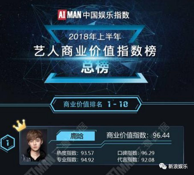 根据榜单显示,去年上半年,鹿晗以96.44的商业指数位居第一位。