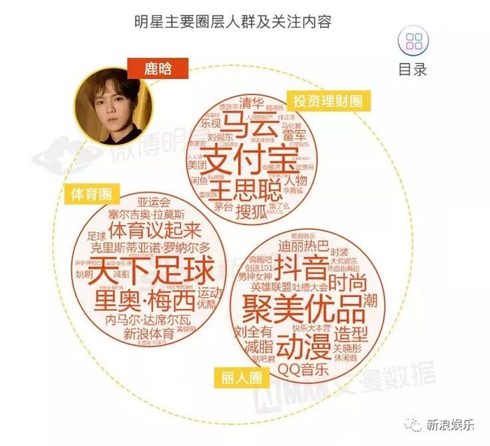 根据今年微博粉丝白皮书数据,鹿晗粉丝群体所关注的内容具有相当高的多样性,涵盖投资理财圈、体育圈和丽人圈等,且分布比较平均。